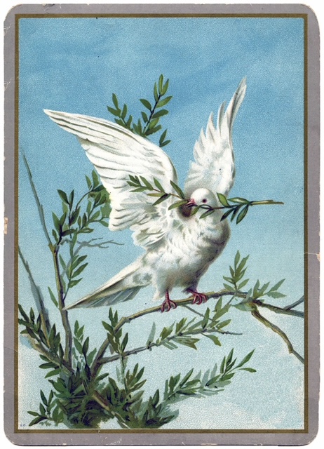 In the beak of the three, the white dove plucks a delicate twig and quietly journeys it home